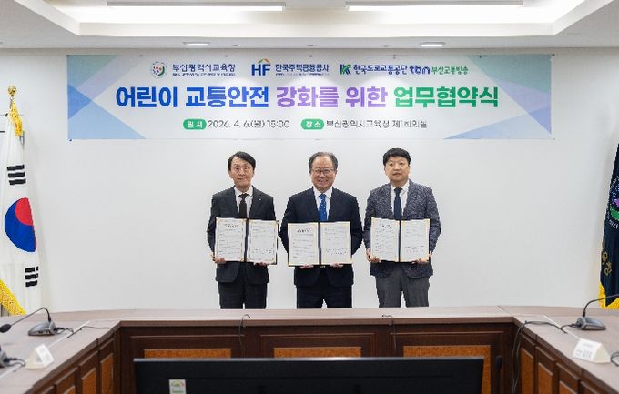 (포탈뉴스통신) 부산광역시교육청은 지난 6일 오후 시교육청 회의실에서 어린이 교통사고 예방과 안전한 통학환경 조성을 위해 한국주택금융공사, 한국도로교통공단 tbn부산교통방송과 ‘어린이 교통안전 강화를 위한 업무 협약’을 체결했다.