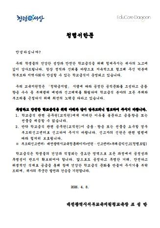 대전 소재 식재료 공급업체를 대상으로 발송한 교육장 청렴 서한문에는 학교급식 관련 공직자에게 금품이나 향응 또는 선물 등을 제공할 수 없음을 명시했다. 또한 관련 공직자가 이를 요구할 경우 대전시교육청 누리집 내 부조리 신고센터로 신고할 수 있도록 안내했다.
