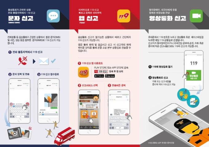 다매체 119 신고서비스는 기존 음성통화 방식 외에도 문자(SMS), 영상통화, 스마트폰 애플리케이션 등을 활용해 신고할 수 있는 제도다.