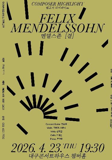 (포탈뉴스통신) 대구문화예술진흥원 대구콘서트하우스는 4월 23일 오후 7시 30분, 챔버홀에서 ‘컴포저 하이라이트 : 멘델스존, 결’을 개최한다.