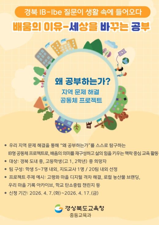 임종식 교육감은 “이번 프로젝트는 학생들이 배움의 이유를 스스로 묻고 답하는 과정에서 삶의 주체로 성장하도록 돕는 의미 있는 교육 활동”이라며, “앞으로도 질문에서 시작해 실천으로 이어지는 교육, 삶과 연결된 배움이 이루어지는 교육 환경을 지속적으로 확대해 나가겠다”라고 말했다.