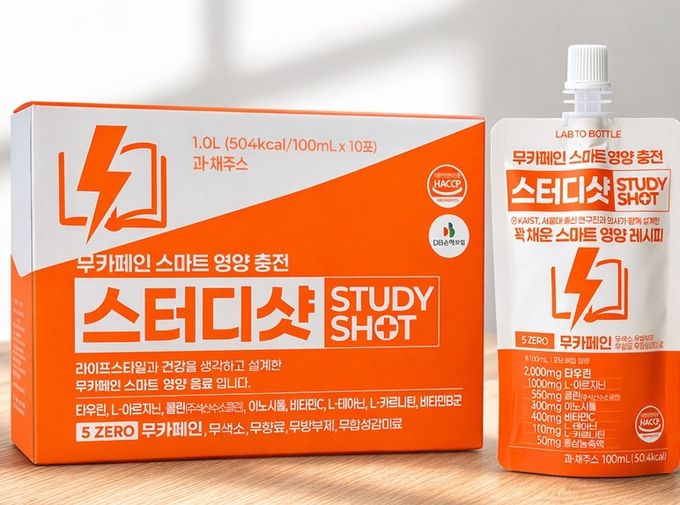 스터디샷은 카페인 부작용을 최소화하기 위해 무카페인 공법을 적용했으며 설탕, 방부제, 향료 등 5가지 성분을 배제한 ‘5무(無)’ 원칙을 지켰다.