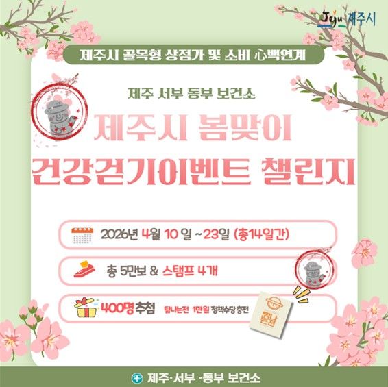 (포탈뉴스통신) 제주보건소는 봄철을 맞아 시민들의 걷기 실천을 활성화하기 위해 4월 10일부터 4월 23일까지 ‘골목형 상점가 연계 봄맞이 건강 걷기 이벤트 챌린지’를 운영한다.