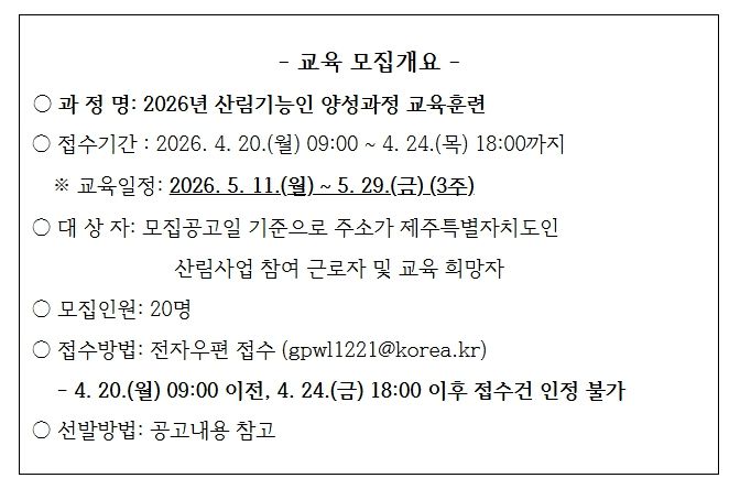 이번 교육은 5월 11일부터 29일까지 3주간 산림조합중앙회 제주지역본부에서 진행되며, 공고일 기준 제주도에 주소지를 둔 도민이면 누구나 신청할 수 있다.
