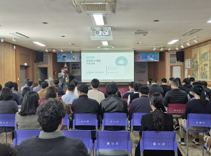 교육 첫날인 8일에 군청 대강당에서 전 직원이 참여한 가운데 ‘생성형 AI 활용 기초 교육’이 진행됐다. 이날 직원들은 AI 혁명의 시대에 나타난 기술의 동향과 이론적인 이해, 그리고 스마트폰 실습을 통해 AI의 기본 개념을 익히고 실제 업무 활용 방안을 직접 체험하며 디지털 전환의 발판을 마련했다.