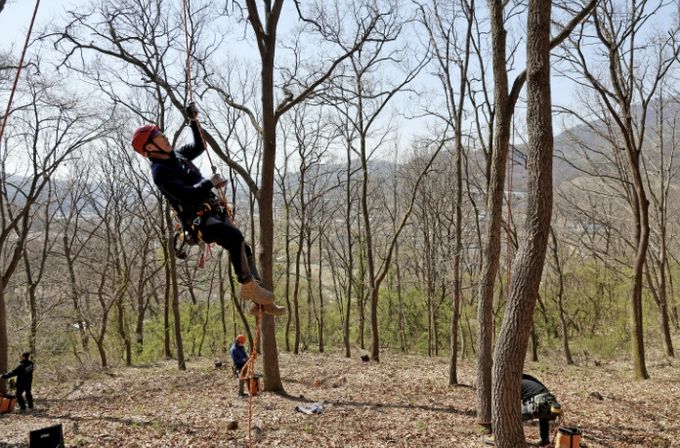 1급 과정을 교육 중인 야외 교육장에서는 10kg이 넘는 묵직한 장비 벨트를 허리에 찬 남성이 능숙하게 로프를 던져 11m 높이의 나무 기둥에 걸었다. 아찔한 높이지만 거침이 없다. 밧줄 하나에 의지해 허공을 오르길 잠시 나무 상단부에 도달한 그가 예리한 톱으로 병든 가지를 골라내자 지켜보던 교육생들 사이에서 응원의 함성이 나왔다.