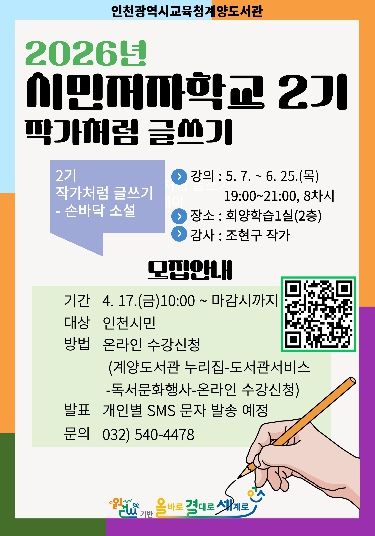 (포탈뉴스통신) 인천광역시교육청계양도서관은 시민의 글쓰기 역량강화와 창작 경험 지원을 위해, 2026년 시민저자학교 2기 ‘작가처럼 글쓰기-손바닥 소설’ 프로그램을 운영한다.
