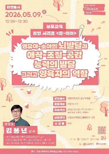 이번 강연에는 김붕년 교수가 강연자로 나선다. 김 교수는 서울대학교 어린이병원 소아청소년정신과 교수로, tvN ‘유 퀴즈 온 더 블럭’, EBS ‘학부모 수업’ 등 다수의 방송과 저서를 통해 아이의 뇌 발달과 심리 상태에 대한 깊이 있는 통찰을 해 온 전문가다.