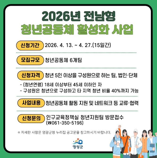 (포탈뉴스통신) 영광군은 청년들의 지역 활동 기반을 마련하고 지역사회 활동 주체로 성장할 수 있도록 지원하기 위해 오는 4월 27일까지 ‘2026년 전남형 청년공동체 활성화 사업’ 참여팀을 모집한다고 밝혔다.