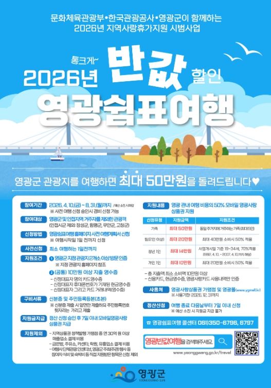 (포탈뉴스통신) 영광군은 지난 4월 10일 오전 9시부터 시작된 ‘2026 지역사랑 휴가지원 시범사업 「영광 쉼표 여행」’ 신청 접수가 하루 만에 1,871명이 접수하며, 4월분으로 예정한 사업비 가 모두 소진될 것으로 예상돼 조기 마감됐다고 밝혔다.