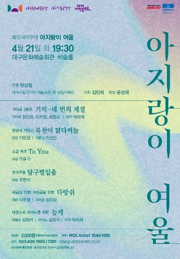 (포탈뉴스통신) 대구시립국악단 화요국악무대 '아지랑이 여울' 공연이 4월 21일 저녁 7시 30분 대구문화예술회관 비슬홀에서 펼쳐진다.