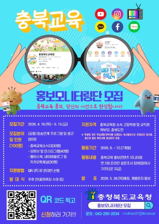 (포탈뉴스통신) 충청북도교육청은 16일부터 5월 15일까지 교육가족과 도민의 다양한 의견을 반영한 홍보를 강화하기 위해 '2026. 충북교육 홍보 모니터링단'을 모집한다.