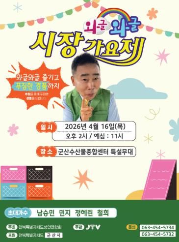 (포탈뉴스통신) 군산시가 전통시장에 활력을 불어넣고 시민과 상인이 함께 어우러지는 문화의 장을 마련하고자 ‘와글와글 시장가요제’를 오는 4월 16일 오후 2시, 군산수산물종합센터 신축 건어동 앞 광장에서 개최한다.