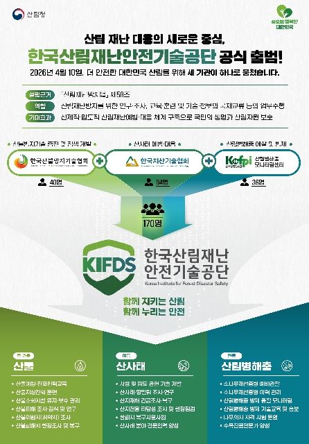 새롭게 출범하는 한국산림재난안전기술공단은 충청북도 청주시 오송읍에 새롭게 둥지를 틀고, 드론・인공지능(AI)・위성정보 등 첨단기술을 활용한 과학적 대응체계를 구축해 산림재난 예방・대비・대응・복구 전 과정을 통합 지원하게 된다.