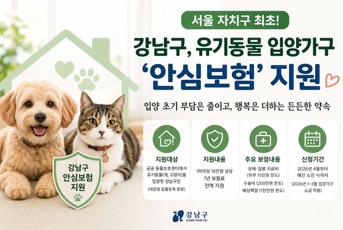 조성명 강남구청장은 “이번 안심보험 지원이 입양을 주저하는 구민들에게 실질적인 도움이 되길 바란다”며 “앞으로도 입양 동물이 소중한 가족의 품에서 건강하게 평생을 함께할 수 있도록 지속 가능한 반려동물 복지 정책을 추진해 나가겠다”고 밝혔다.