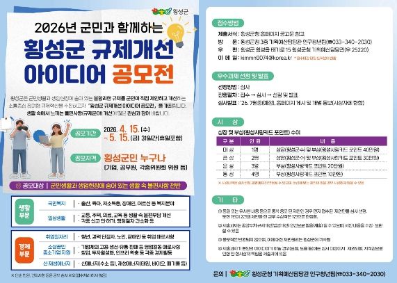 (포탈뉴스통신) 횡성군이 군민의 일상생활과 생업현장에서 겪고 있는 각종 불합리한 규제를 개선하기 위해 ‘2026년 횡성군 규제개선 아이디어 공모전’을 개최한다.