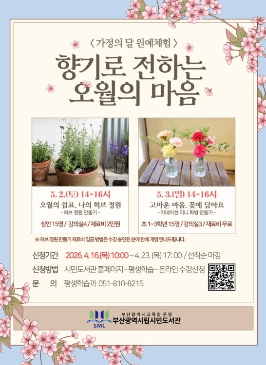 (포탈뉴스통신) 부산광역시립시민도서관은 오는 5월 2일과 3일 시민도서관 강의실에서 성인과 초등학생 30명을 대상으로 가정의 달 원예체험 ‘향기로 전하는 오월의 마음’을 운영한다.