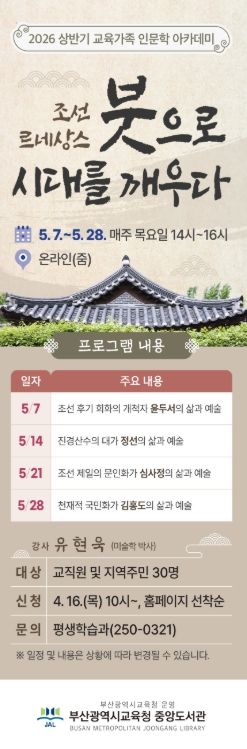 (포탈뉴스통신) 부산광역시립중앙도서관은 오는 5월 7일부터 28일까지 매주 목요일마다 4회에 걸쳐 교직원 및 지역주민 30명을 대상으로 온라인(ZOOM)을 통해 인문학 아카데미 ‘조선 르네상스, 붓으로 시대를 깨우다’를 운영한다.