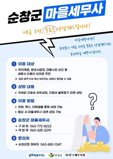 현재 순창군에는 2명의 마을세무사가 활동 중이며, 세무상담을 희망하는 군민은 남원 소재 세무사 전화 또는 서면상담을 신청하면 된다.