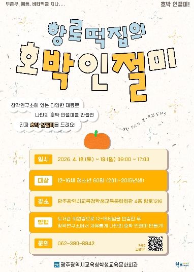 (포탈뉴스통신) 광주시교육청학생교육문화회관은 오는 18~19일 회관 내 청소년 전용 공간 ‘항로1216’에서 ‘호박 인절미 창작 챌린지’를 운영한다.