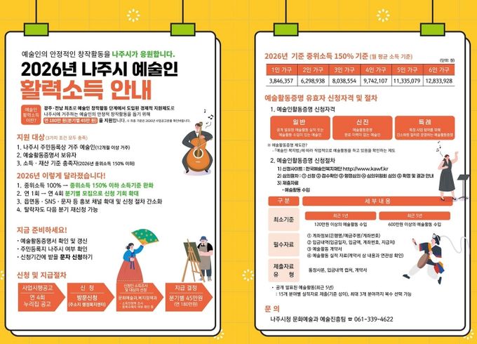 15일 나주시에 따르면 지역 예술인의 안정적인 창작 활동을 돕기 위해 ‘2026년 2분기 예술인 활력소득 지원금’ 신청을 받고 있다.