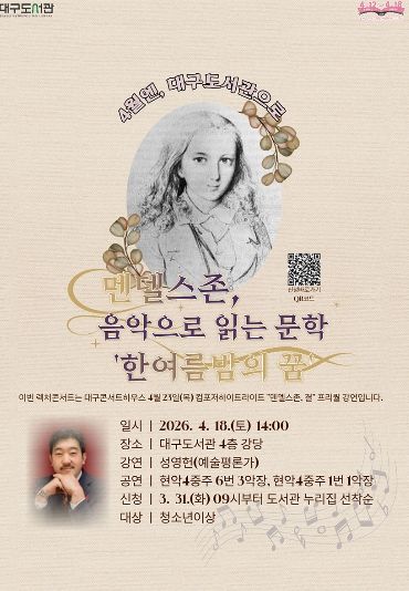 (포탈뉴스통신) 대구도서관은 4월 도서관 주간을 맞아 대구콘서트하우스와 협업해 특별 렉처콘서트 ‘멘델스존 음악으로 읽는 문학’을 4월 18일 오후 2시에 개최한다.