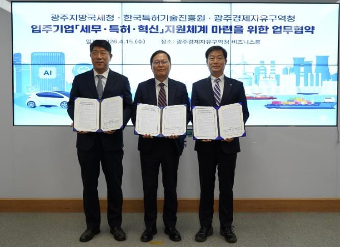 (포탈뉴스통신) 광주경제자유구역청은 15일 경자청 비즈니스룸에서 광주지방국세청, (재)한국특허기술진흥원과 ‘광주경제자유구역 핵심 전략산업 기업 육성 및 기술 경쟁력 강화를 위한 업무협약’을 체결했다.