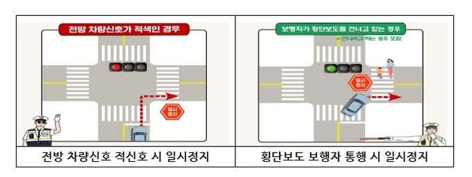 그러나 현장에서는 전방 차량 적신호 시 일시정지하지 않고 그대로 통과하거나, 일시정지 의무를 지키는 앞 차량을 향해 경적을 울리는 등 운전자 간 마찰과 법규 오인 사례가 발생하고 있어, 국민적 이해도를 높이기 위해 우회전 사고 위험이 높은 구간을 중심으로 집중단속을 실시한다. 차체가 커 우회전 시 보행자를 발견하기 어려운 버스・화물차 등의 사고 예방을 위한 운수업체 대상 교육·홍보도 적극적으로 실시할 방침이다.