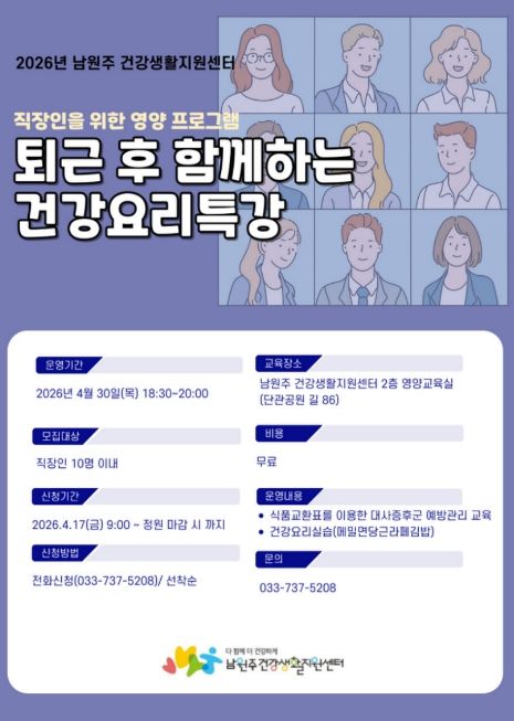 (포탈뉴스통신) 남원주건강생활지원센터는 직장인을 위한 영양 프로그램 ‘퇴근 후 함께하는 건강요리특강’ 참여자를 모집한다.