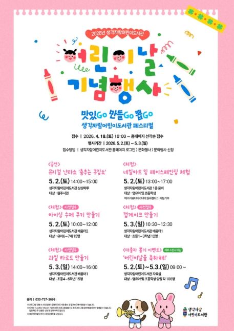 (포탈뉴스통신) 원주시 생각자람어린이도서관은 어린이날을 맞아 5월 2일부터 3일까지 2일간 ‘맛있GO 만들GO 뽑GO’ 페스티벌을 운영한다.