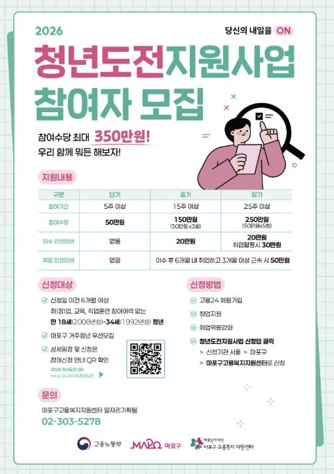 한편, 현재 단기프로그램 20명, 중기프로그램 3기 21명을 모집 중이며, 참여를 희망하는 청년은 마포구고용복지지원센터 또는 고용24 누리집을 통해 신청할 수 있다.