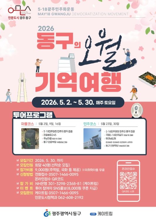 (포탈뉴스통신) 광주 동구는 제46주년 5·18민주화운동을 기념해 5월 한 달 동안 기념 투어 프로그램인 ‘동구의 오월 기억여행’을 운영한다고 밝혔다.