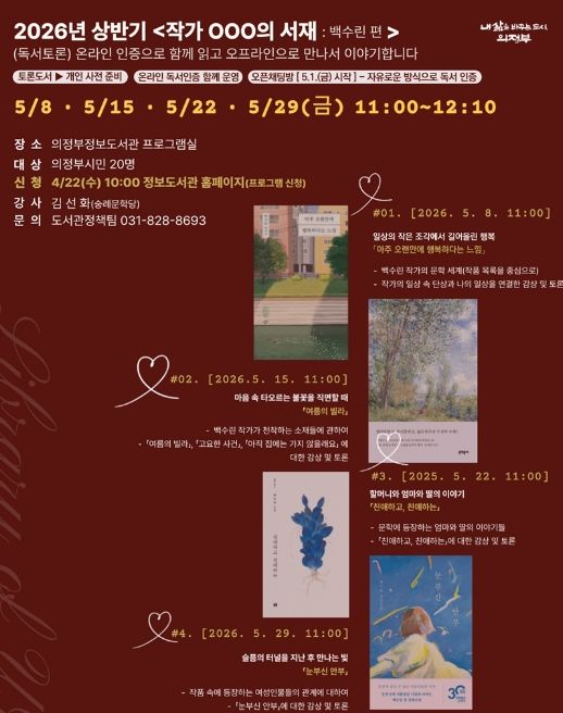 (포탈뉴스통신) 의정부시는 2026년 상반기 ‘작가 OOO의 서재: 백수린 편’을 5월 매주 금요일(8일, 15일, 22일, 29일) 총 4회에 걸쳐 의정부정보도서관에서 운영한다.