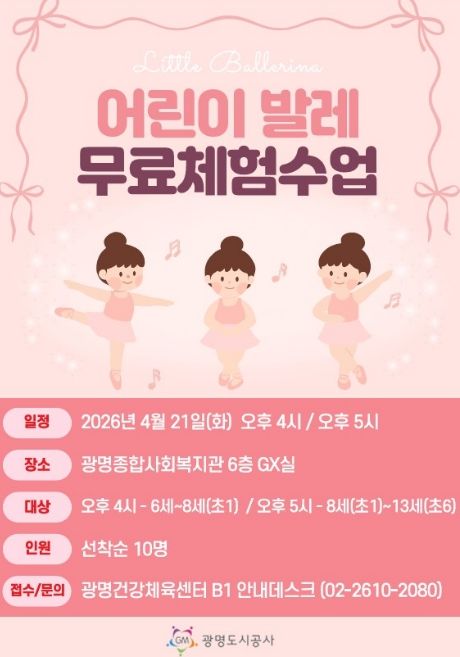 운영 프로그램은 K-POP 댄스와 어린이 발레 2개 종목으로 구성된다. 상세 일정은 ▲어린이 발레 4월 21일 ▲K-POP 댄스 4월 22일이며, 광명종합사회복지관 6층 GX실에서 진행될 예정이다.