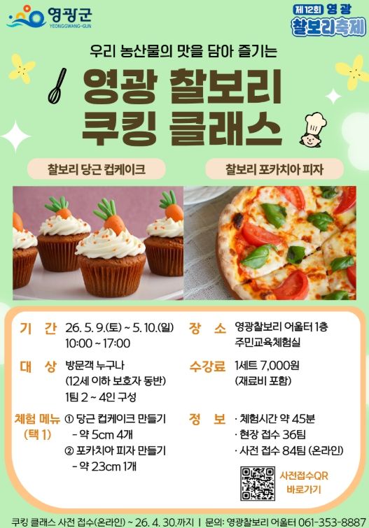 (포탈뉴스통신) 영광군은 오는 5월 9일부터 5월 10일까지 열리는 ‘영광 찰보리 축제’ 기간 동안, 찰보리를 활용한 체험 프로그램인 ‘찰보리 쿠킹클래스’를 운영한다고 밝혔다.