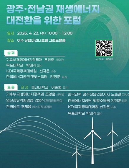 (포탈뉴스통신) 기후에너지환경부 영산강유역환경청은 ‘대한민국 녹색대전환(K-GX) 국제주간 행사’를 맞아, 4월 22일 전라남도 여수시 유탑마리나호텔에서 (재)녹색에너지연구원과 함께'광주·전남권 재생에너지 대전환을 위한 포럼'을 개최한다고 밝혔다.