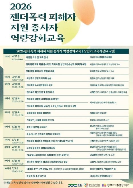 (포탈뉴스통신) 경기도와 경기도젠더폭력통합대응단이 17일 도내 젠더폭력 피해 지원 현장 종사자들의 전문성 향상을 위한 ‘2026 역량강화 교육’ 상반기 과정을 시작하며 현장 대응력 강화에 나섰다.