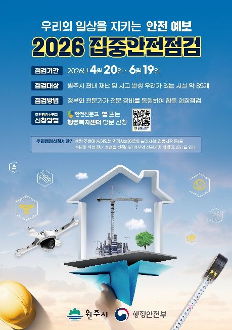 (포탈뉴스통신) 원주시는 4월 20일부터 6월 19일까지 61일간 ‘2026년 집중안전점검’을 추진한다.