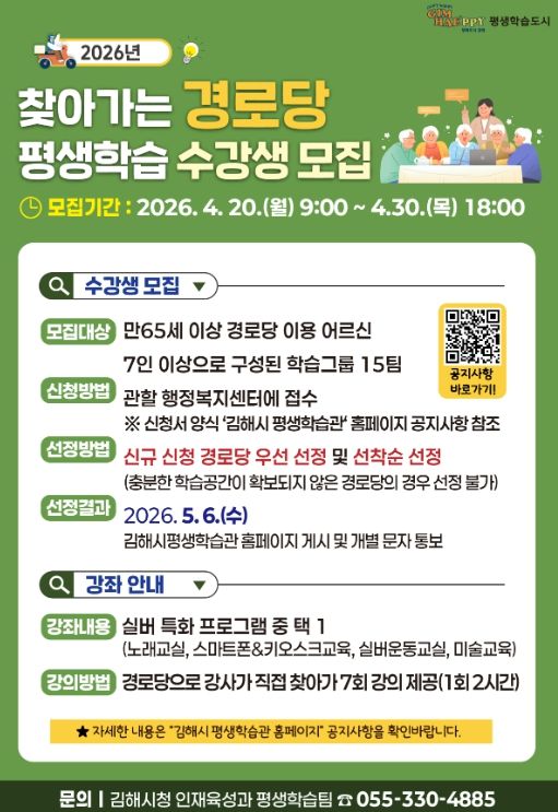 특히 올해는 어르신들의 정서적 안정과 창의성 향상을 위한 ‘미술교육’이 새롭게 추가돼 눈길을 끈다. 선정 결과는 5월 6일 김해시 평생학습관 누리집에 공지된다.