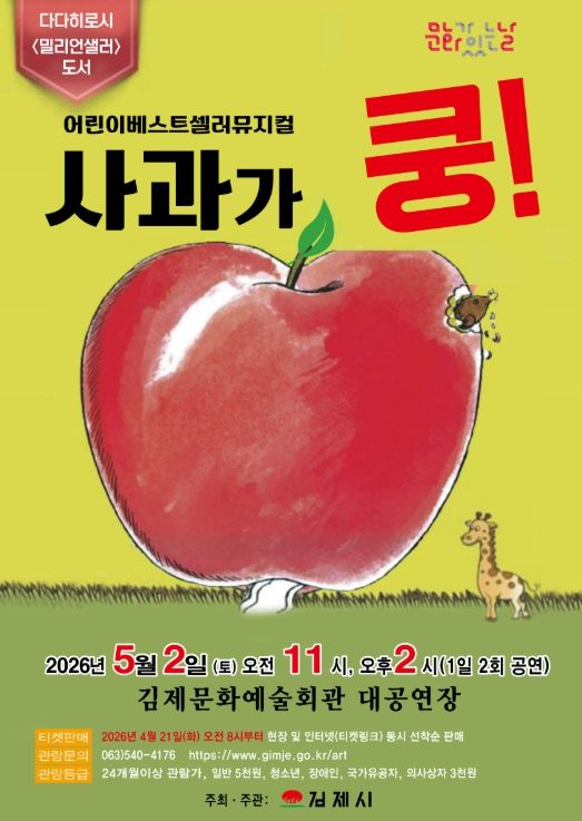 (포탈뉴스통신) 동화 속 세상이 무대위로 뿅~ 베스트셀러이자 스테디셀러인 동화를 각색해 만든 어린이 뮤지컬 <사과가 쿵!~>이 오는 5월 2일 오전 11시, 오후 2시 김제문화예술회관 대공연장에서 펼쳐진다.