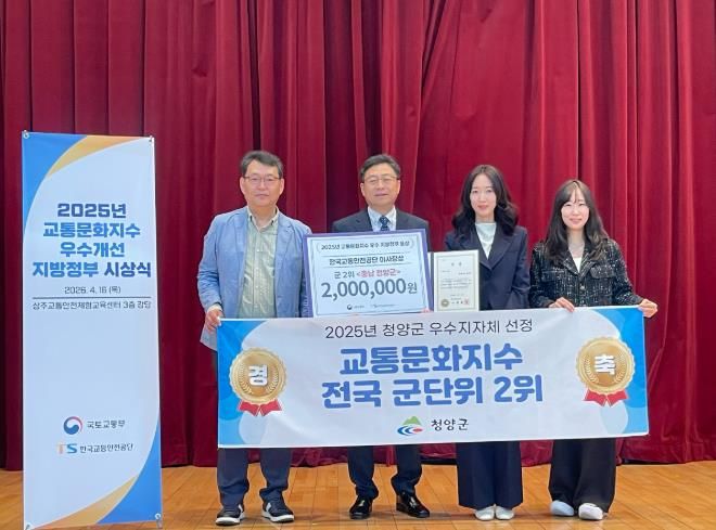 (포탈뉴스통신) 청양군이 한국교통안전공단 주관 ‘2025년 교통문화지수 실태조사’에서 전국 80개 군 지역 중 2위(A등급)를 차지하며 명실상부한 교통안전 선도 도시로 우뚝 섰다.