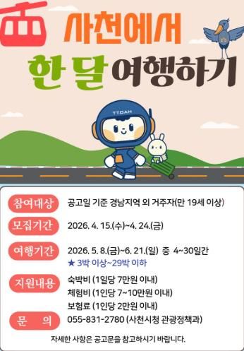 (포탈뉴스통신) 사천시는 체류형 관광 활성화와 지역 관광자원 홍보를 위해 ‘사천에서 한 달 여행하기’ 1차 참가자를 4월 15일부터 4월 24일까지 모집한다.