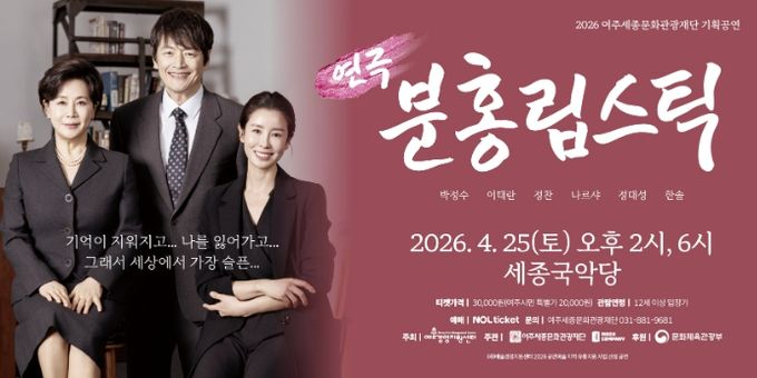 (포탈뉴스통신) 여주세종문화관광재단이 오는 4월 25일, 예술경영지원센터의 공모사업인 '공연예술 지역 유통지원 사업'의 일환으로 베테랑 배우들이 참여한 창작 연극‘분홍립스틱’을 세종국악당에서 개최한다.