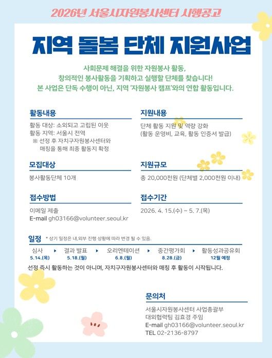 (포탈뉴스통신) 서울시자원봉사센터는 복지 사각지대 주민의 외로움 해소를 위해 자치구자원봉사센터(자원봉사 캠프)와 협력하여 신규 봉사활동을 기획하고 운영할 비영리 단체를 모집한다고 밝혔다.