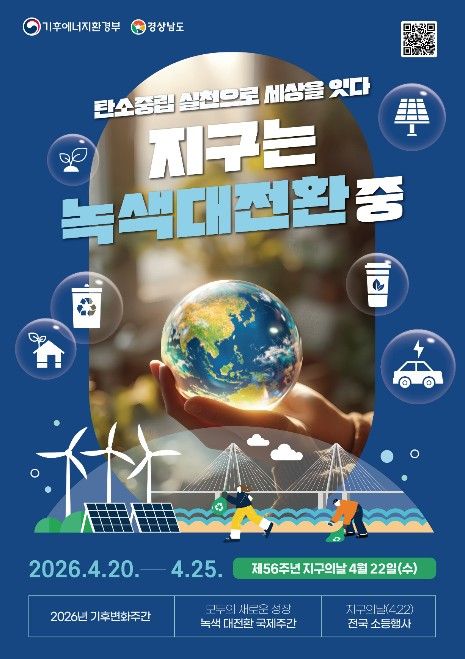 (포탈뉴스통신) 경상남도는 56주년 ‘지구의 날’을 기념해 탄소중립에 대한 도민 인식을 높이고 생활 속 실천 문화를 확산하기 위해 20일부터 24일까지 5일간 ‘제18회 기후변화주간’을 운영한다고 밝혔다.