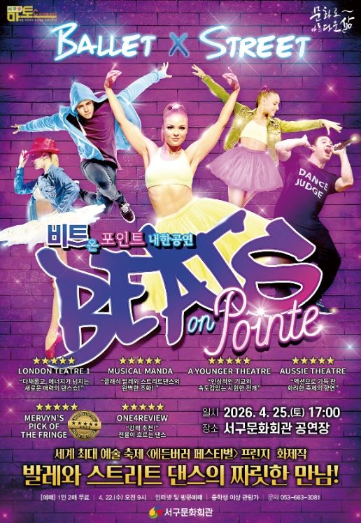 (포탈뉴스통신) 서구문화회관은 4월 25일 오후 5시 서구문화회관 공연장에서 4월 서구愛 마토콘서트로 댄스 퍼포먼스'비트 온 포인트'내한 공연을 개최한다.
