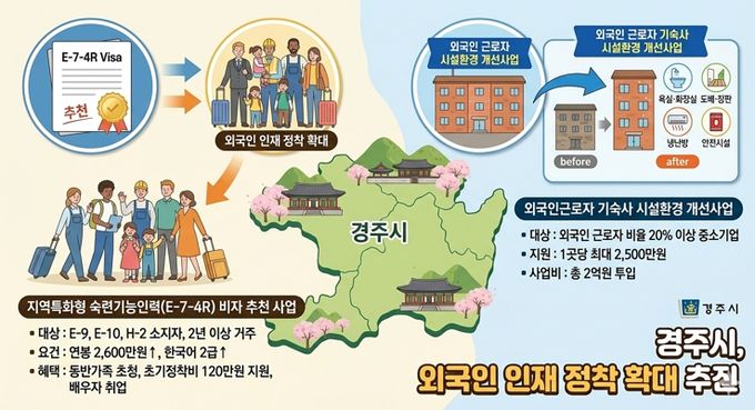 (포탈뉴스통신) 경주시는 외국인 인재 정착을 확대하기 위해 ‘지역특화형 숙련기능인력(E-7-4R) 비자 추천 사업’과 ‘외국인 근로자 기숙사 시설환경 개선사업’을 추진한다고 19일 밝혔다.
