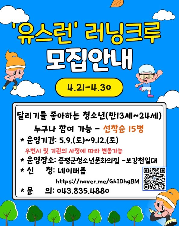 (포탈뉴스통신) 충북 증평군청소년문화의집이 청소년들이 직접 기획하고 운영하는 주도형 러닝크루 ‘유스런 러닝크루’를 모집한다.
