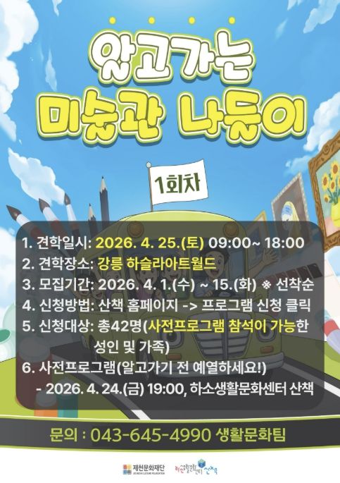 오는 25일 진행되는 1회차 견학은 강원도 강릉에 위치한 하슬라아트월드에서 진행되며, 카카오톡 채널 ‘제천문화통통’을 통해 사전 모집된 40여 명의 제천시민이 참여한다.