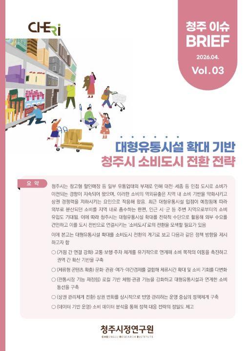 (포탈뉴스통신) 청주시정연구원은 대형유통시설 확대에 따른 소비구조 변화와 이에 대한 정책 대응 전략을 담은 이슈브리프를 발간했다고 20일 밝혔다.